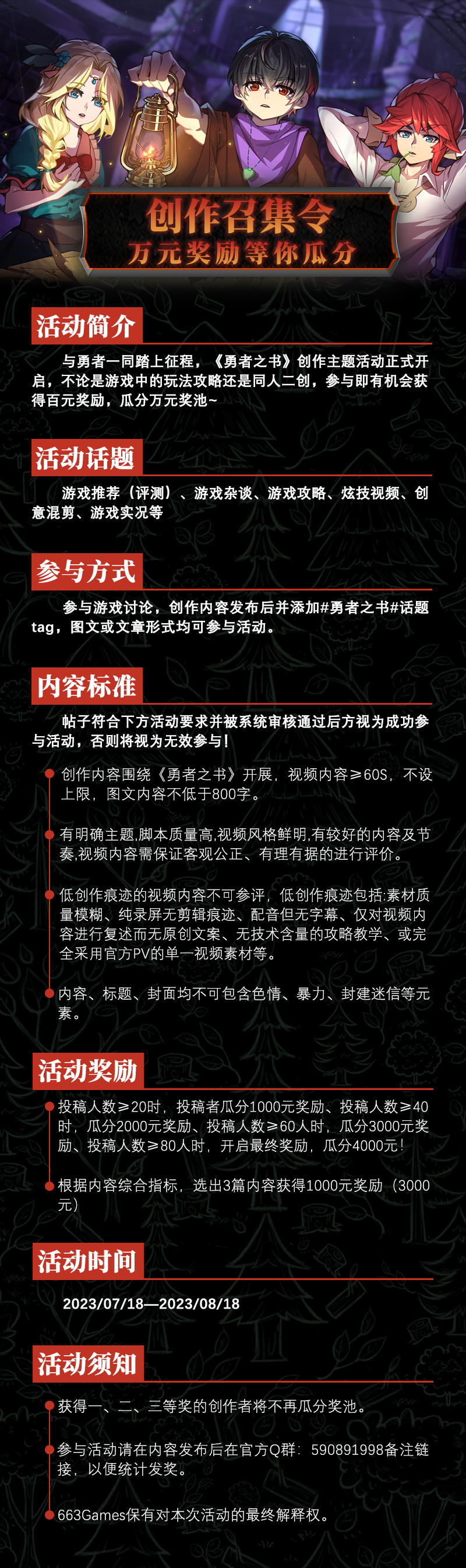 创作内容围绕《勇者之书》开展,视频内容≥60S,不设上限,图文内容不低于800字;