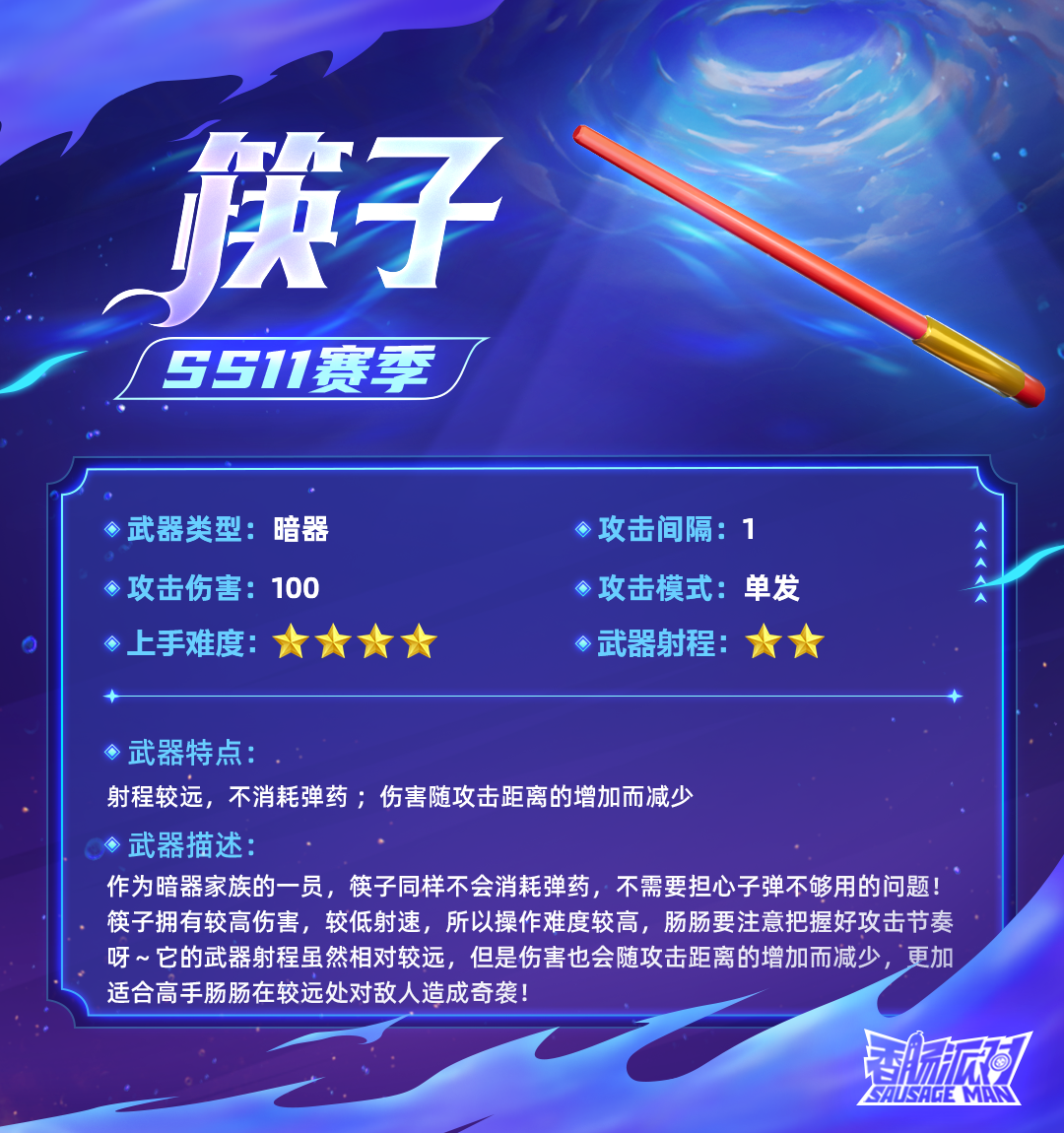 筷子:为了体现筷子方便携带的特点,会把它装备在第三号武器位,与其他的枪械不同,筷子不消耗弹药!筷子的射击模式为单发,肠肠们可以运用筷子的较远射程对远处的敌人发出意想不到的攻击!肠肠们需要注意筷子的伤害随攻击的距离的增加而减少且射速相对较慢,所以肠肠需要注意好攻击节奏!