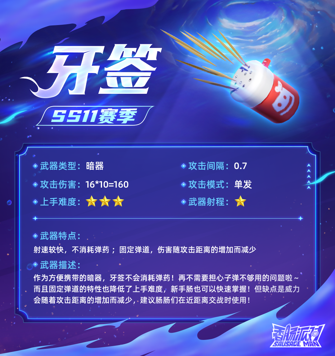 牙签:牙签每次会射出十根且不消耗弹药,会装备在第三号武器位,可以借助较快的射速和固定弹道的优势,对敌人造成强大的压制!射出的投掷物会短暂的留在被攻击的物品或人物上。肠肠们需要注意的是牙签的伤害会随攻击距离衰减,所以在近处使用牙签是最好的选择。