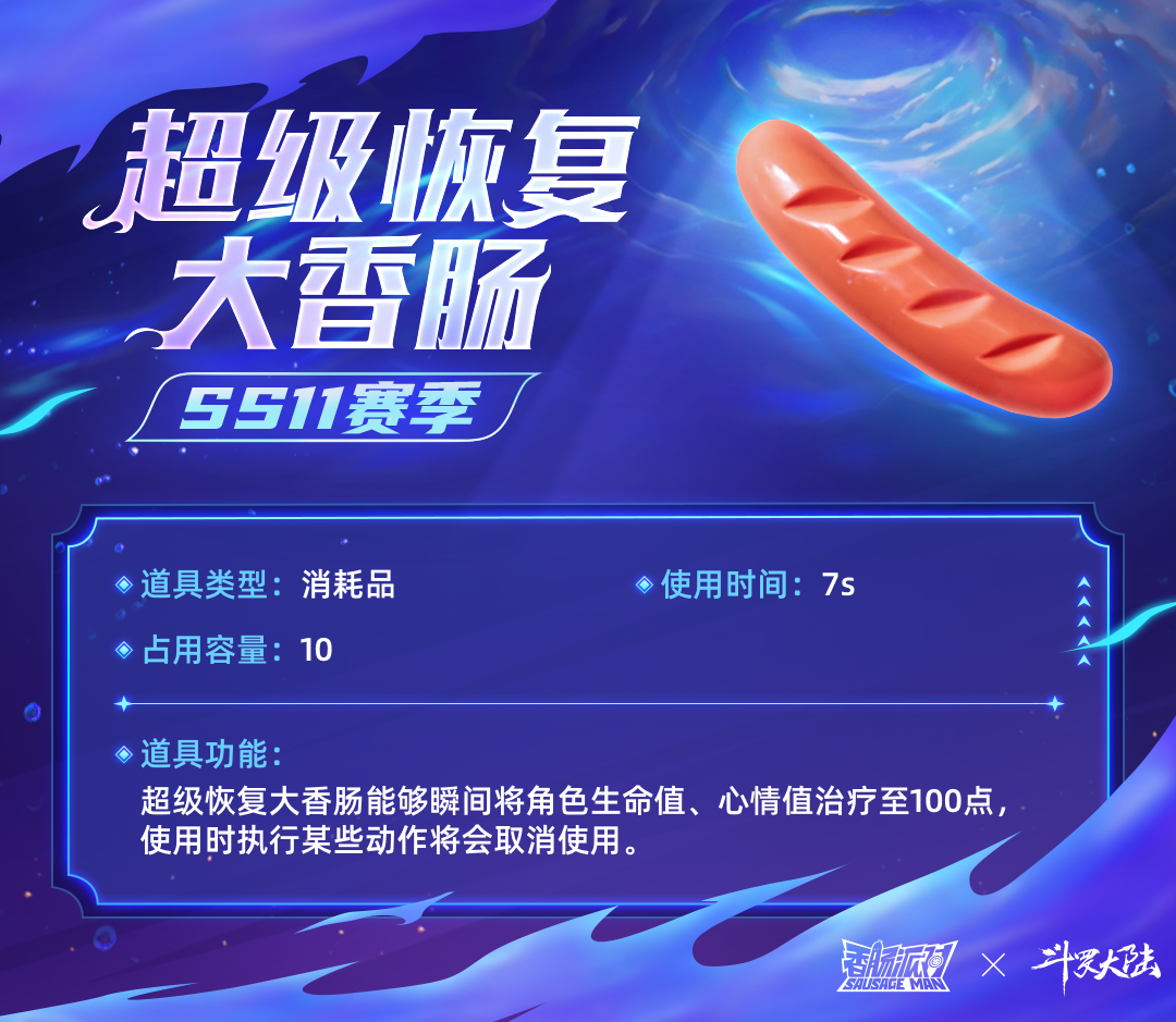 超级恢复大香肠:只要吃掉它就能瞬间将肠肠的生命值与心情值治疗到100点,(和医疗箱作用一样)