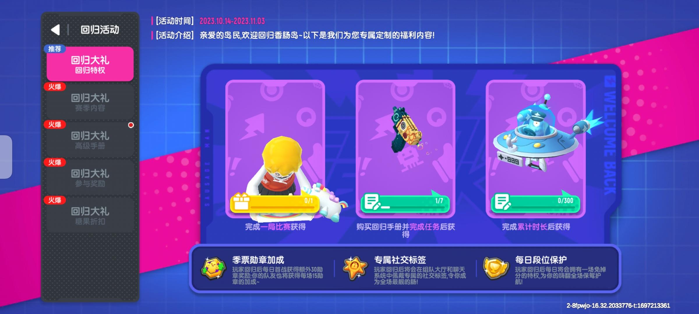 7天以及以上没有上线过的玩家会在左上角有一个回归活动,时间为30天。点进去后,会看见里面有五项内容:第一个是回归特权,在这里面时为回归玩家准备三大特权的详细内容(主要有季票徽章加成,专属社交标签,以及 每日段位保护!)