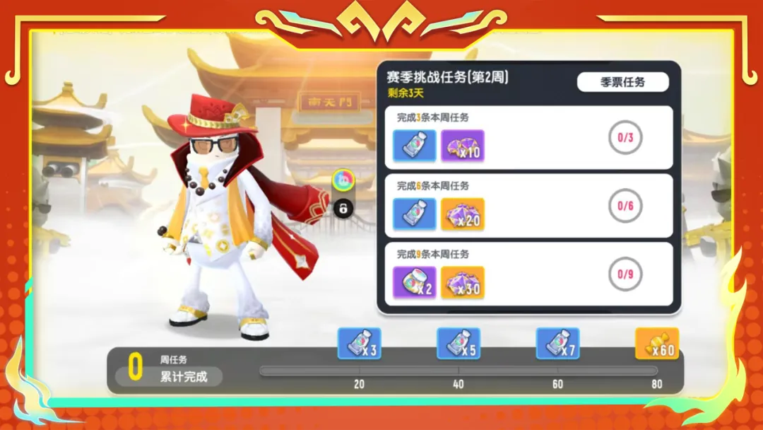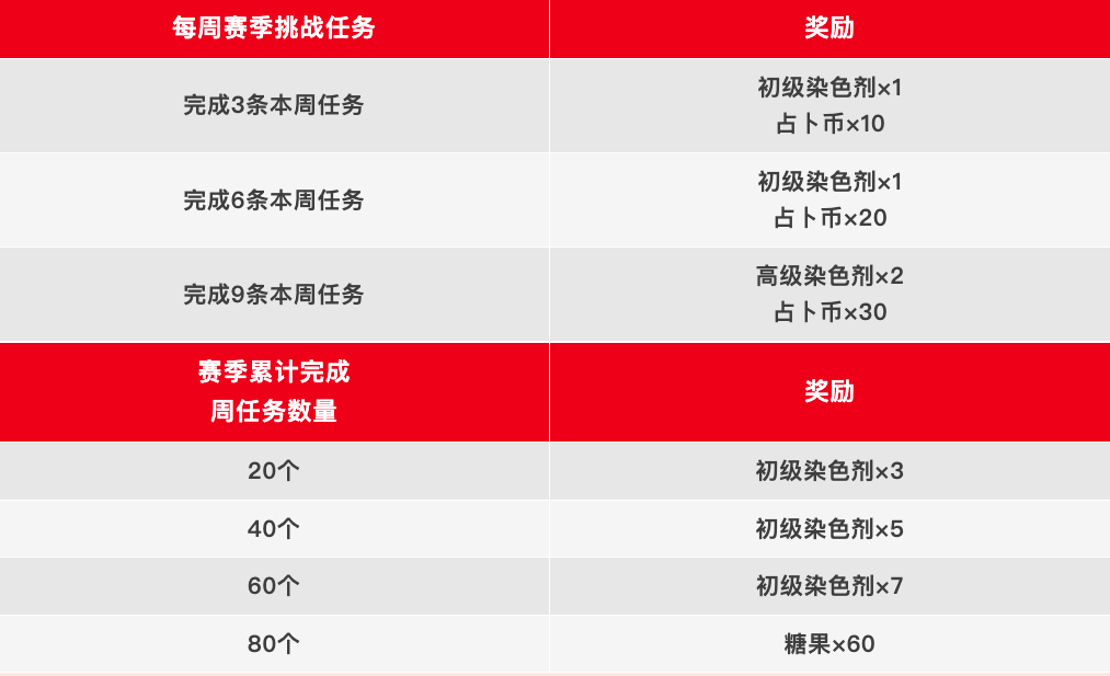 累计完成指定数量的当周季票任务,即可获得染色道具和占卜币!在整个赛季累计完成一定数量的周任务后,还将获得染色道具和糖果奖励!