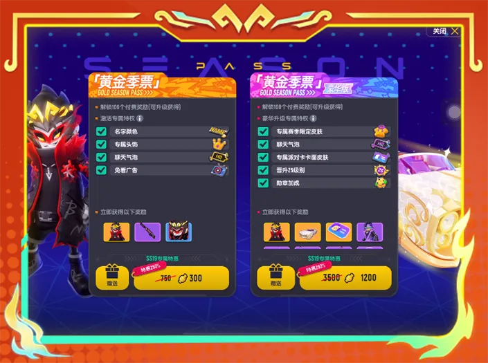 在本次的黄金季票豪华版中也将包含全新的豪华版专属奖励,包括专属赛季限定皮肤、专属派对卡卡面皮肤、专属聊天气泡框、季票任务额外勋章加成、季票等级直接提升25级等