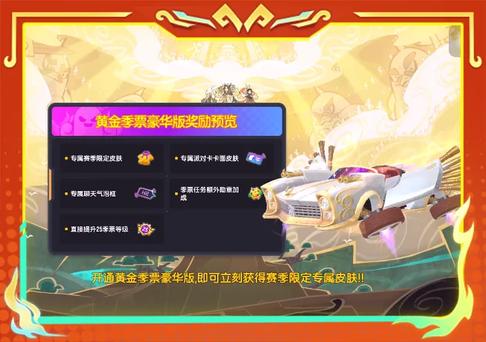 开通黄金季票豪华版即可立即获得赛季限定专属皮肤飞车-龙斯莱斯以及豪华版专属卡面