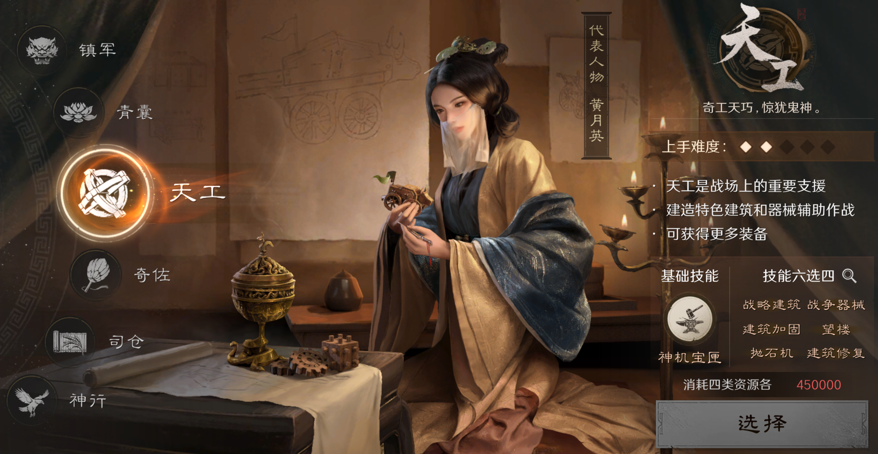 战场后期的天工需要根据战场形势加点,需要防守就点出「望楼」和「建筑修复」,需要进攻就点出「抛石机」和「战争器械」。