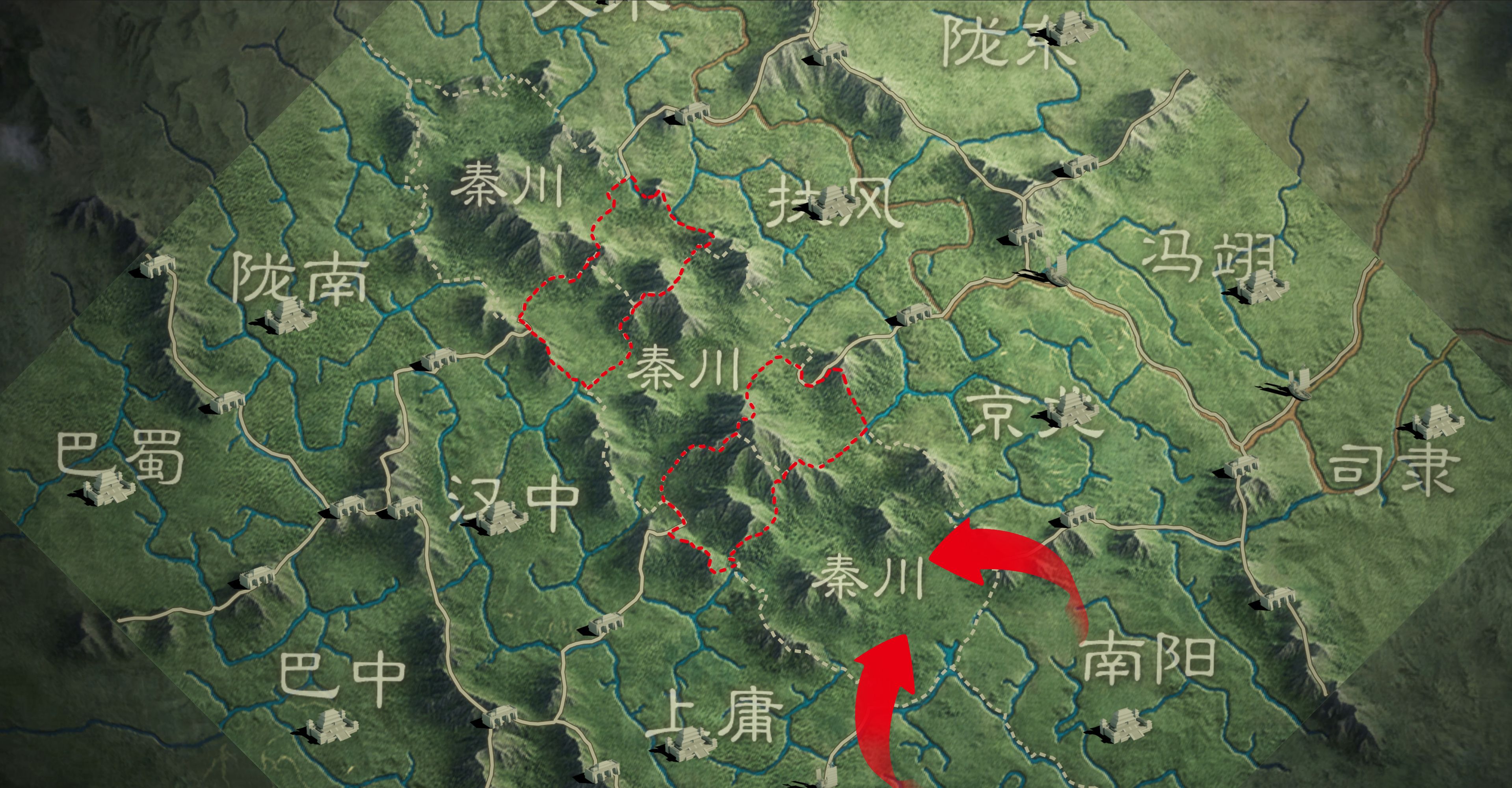 地图中间绝大部分为秦川地区,秦川左侧资源州的为天水对陇南,右侧为南阳对荆襄。秦川左右侧虽然均为资源州单对单,但其战场形势截然不同。