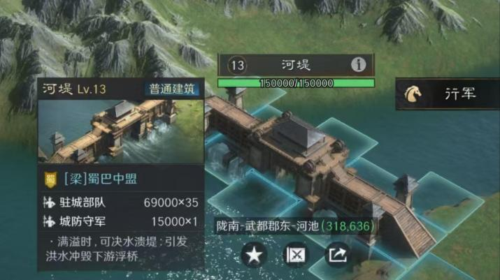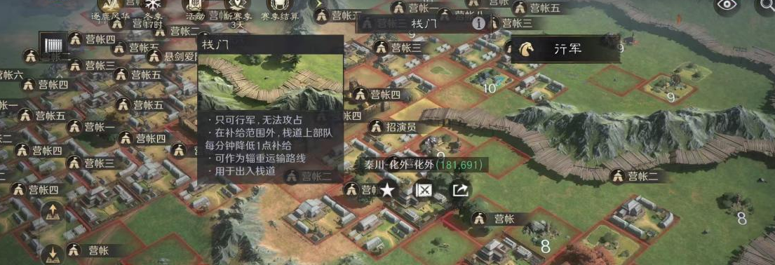 通过这些描述,我们可以知道秦川地区的争夺将围绕各个军寨、栈门、浮桥展开,需要注意的是在栈道上行军时会有补给下降状态,而河堤的功能则与历史上著名的水淹七军类似。
