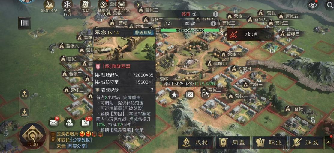 而来到秦川右侧战场我们可以发现:秦川右侧为大规模兵团作战之地,核心比拼的是双方的实力、活跃、战时响应度,因此此处适合活跃度较高的同盟进行征战。